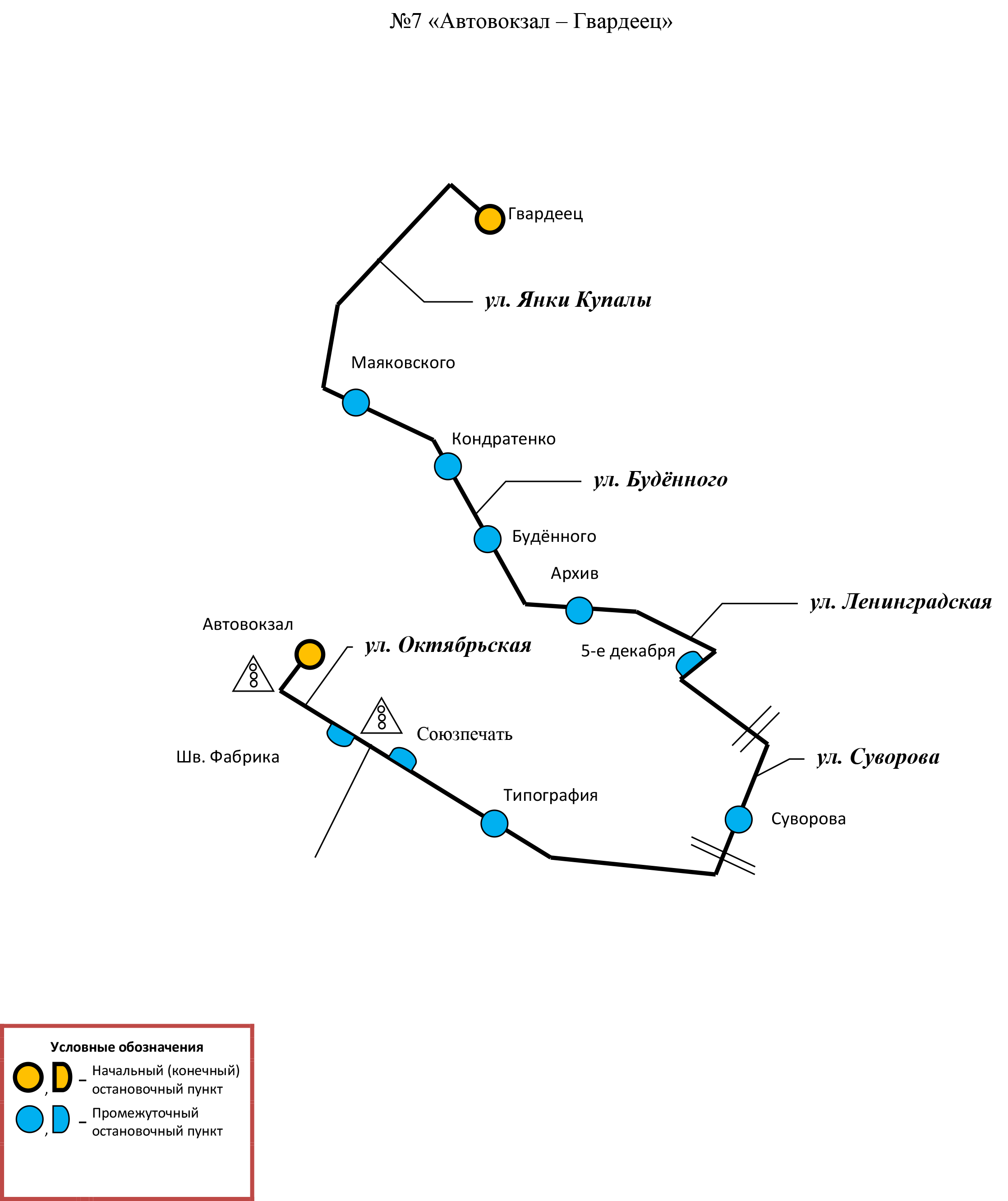 Прямое направление: «Швейная фабрика», «Типография», «Суворова», «Архив», «Будённого», «Кондратенко», «Маяковского», «Гвардеец».